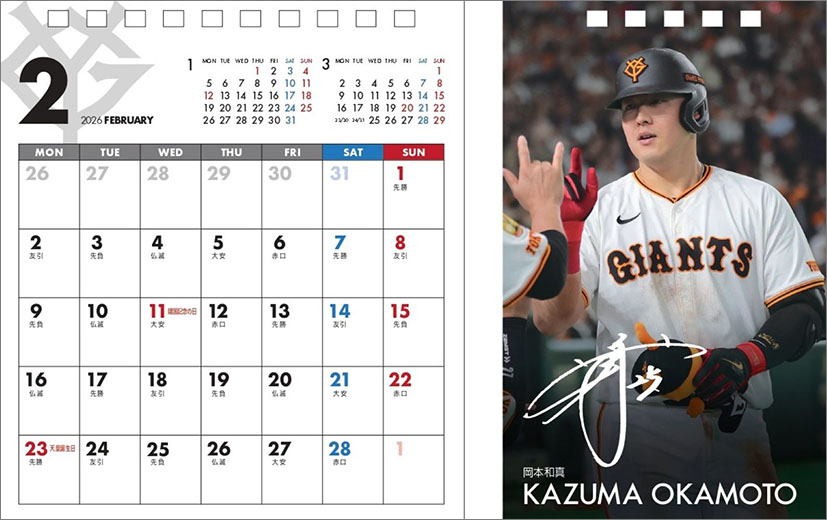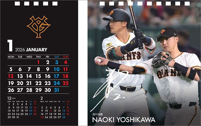 ジャイアンツ主力選手たちがコンパクトなサイズで机上を飾ります。暦と選手写真が別々なので、その日の気分で好きな選手を楽しめます。掲載は阿部慎之助監督はじめ吉川尚輝、岡本和真、山﨑伊織、戸郷翔征、甲斐拓也、大勢、井上温大、大城卓三、丸佳浩、小林誠司、坂本勇人、長野久義です。