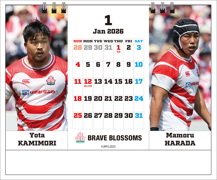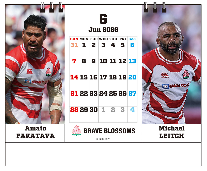 ラグビー日本代表選手の2026年度卓上カレンダー。桜のエンブレムを胸に、強靭な身体と精神力がぶつかり合う迫力あるプレーシーンを収録。
