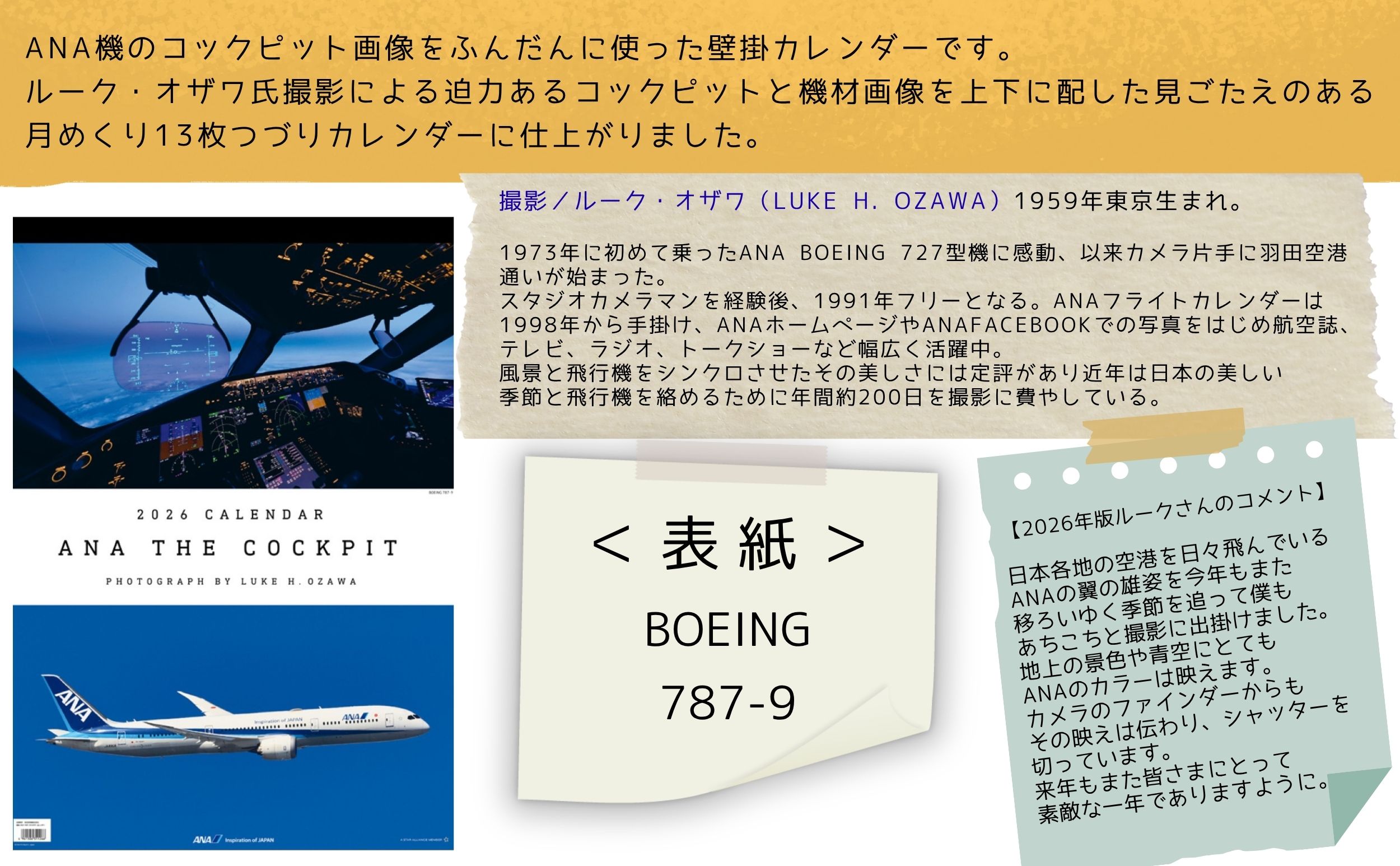 ANA機のコックピット画像をふんだんに使った壁掛カレンダーです。ルーク・オザワ氏撮影による迫力あるコックピットと機材画像を上下に配した見ごたえのある月めくり13枚つづりカレンダーに仕上がりました。
